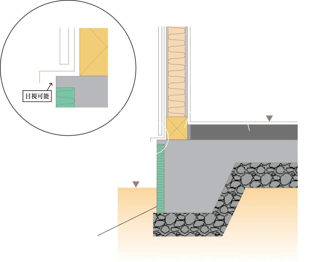 万が一基礎外周部と基礎外断熱材との間に蟻道をつくられた場合でも、外部から目視が可能とするために、基礎コンクリートの一部に断熱材で覆わずにコンクリートをあえて露出させる施工を行っています。