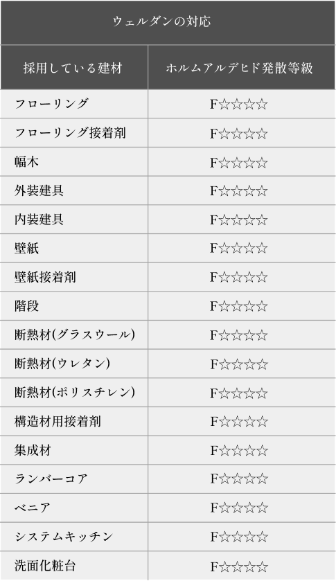 ウェルダンでは、建築基準法にて全く使用制限を受けない最上位等級(F☆☆☆☆)の建築資材を標準採用しています。