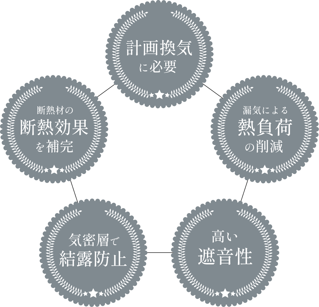 気密性を高めることによって、熱損失が少なく冷暖房効率のよい省エネ住宅となるとともに、計画換気における換気効率を高めることが可能です。