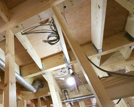 気密性能を高めるためには電気設備業者も大切な役割を果たします。住宅の壁内部や天井部には無数の電気配線が縦横に走り、構造体に穴を開けて貫通させている場所が多くあります。