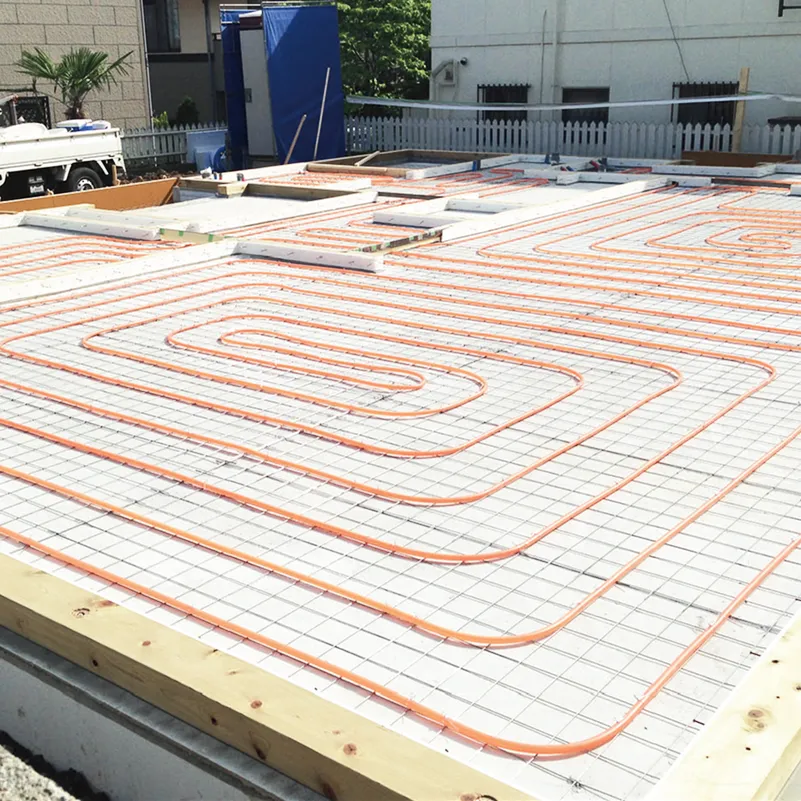 - 床暖房の温水配管は高分子樹脂製で、しかもモルタル内に密封されており、紫外線の影響もないため、耐久性は半永久です。