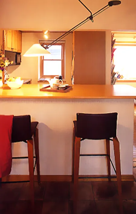 カウンターで仕切られたセミオープンキッチンは、初めて来たアシスタントにも使いやすいようにと考えて作りました。何がどこにあるかすぐに分かるように、収納棚を扉のないオープン棚にして、ガスレンジの脇には調理器具を吊り下げるレードルを取り付けました。また、地球に優しい生活を送りたいと思い、ソーラーシステムを導入。「ウェルダン」の高気密・高断熱住宅は省エネルギー住宅だから、毎日の生活に必要な電気をしっかり自給できます。日照時間の長い夏には、余った電力を電力会社に買ってもらうこともあるんですよ。