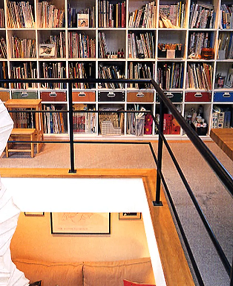 多くの資料や道具をしっかり納めるため、両サイドの壁面に床から天井まで届く書棚を特別に作りました。棚は、同じサイズに仕切り、ジャンル別に分類。こんなにギッシリ資料や本に囲まれているのに圧迫感を感じないで快適に過ごせるのは、「ウェルダン」さんがよく考えて設計してくださったおかげです。