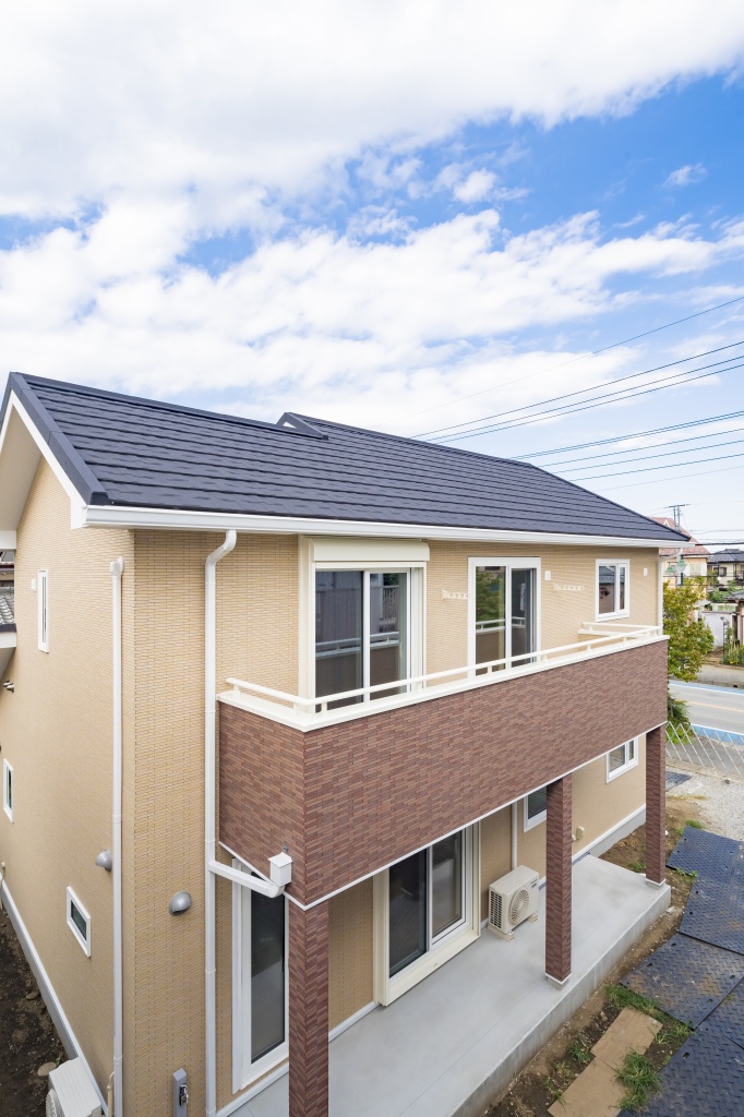 外装材は全面LIXILのセラヴィオというタイルを使用しました。幅広い色合いにも合わせやすい色調で、細かい割り肌調のタイル材です。全体的にやさしい色味となりました。