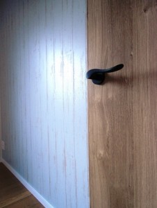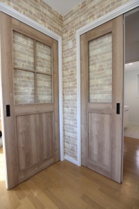 内部ドアはLIXILファミリーラインパレットのラフでアンティークな仕上げと黒のアイアイン調のドアノブが雰囲気を演出しています。